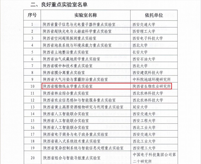近日,陕西省科学技术厅公布了2024年度陕西省重点实验室考核评估结果(陕科办发﹝2025﹞4号),陕西省植物线虫学重点实验室荣获“良好”。